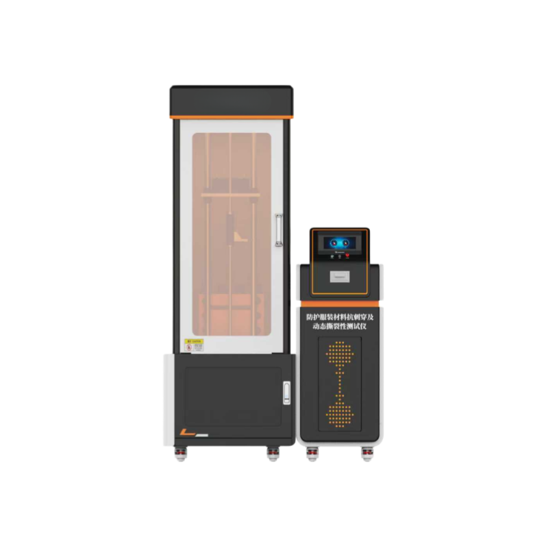防护服装材料抗刺穿及动态撕裂性测试仪用于对等使用的材料,对于刃具的扎入、撕破行为的耐冲击特性进行动态评价的试验机。将试样表面与落下的刃具呈垂直方向安装、使安装刃具的重锤由一定距离开始落下,测定由于重锤冲击能量使试样产生的撕破长度,据此评价被试验材料的动态撕破抵抗性。重锤的冲击能量是通过光电感知器测定出重锤落下时间并自动测定出将要冲入试样表面之前的落下速度,通过使用重锤的质量求出运动能