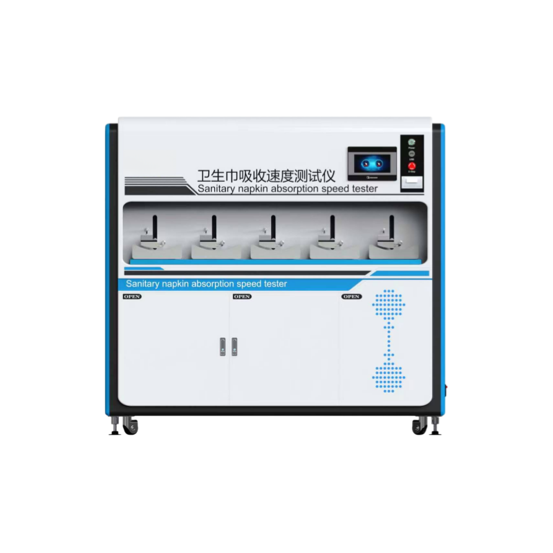 工作原理:卫生巾粘粘在吸收速度测试赛的弧形试样座上,标准测试模块置于样品表面吸收区域,自动加液装置将一定体积的标准合成试液加入标准测试模块中,计时器记录卫生巾完全吸收标准合成试液的时间,表示其吸收速度。